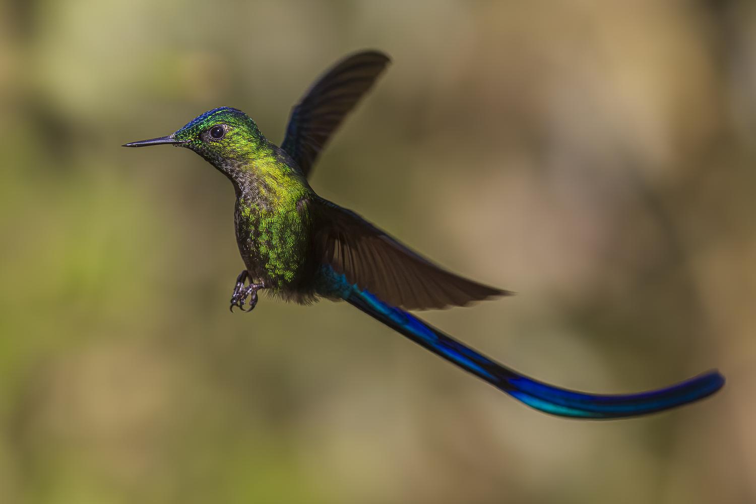 I photographed this Long-tailed Sylph (Aglaiocercus kingii) in flight in October 2021 in Ecuador.