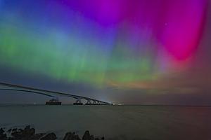 Northern Lights with the Zeelandbrug, the Netherlands