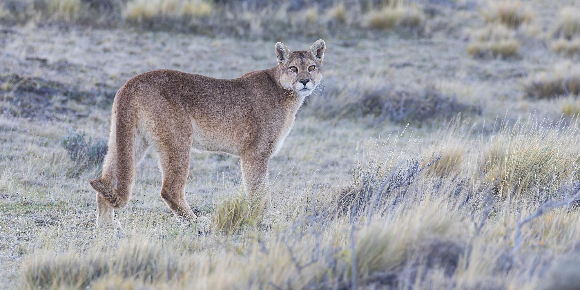 When the day was almost at its end I saw this female Puma (Puma concolor) walking through the vegetation of Chilean Patagonia in June 2019. The animal looked back once and I was able to take this picture.