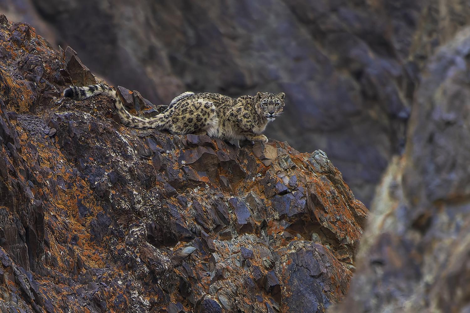 This female Snow Leopard (Panthera uncia) took up a perch on a cliff overlooking a valley. I was able to approach from a distance and watch the animal at eye-level. I saw this big cat in Ladakh in India in March 2023.