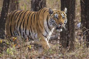 This Tiger (Panthera tigris) was walking through the forest for a while when it suddenly approach the road. I was able to get this picture just as it was coming out from between the trees. I saw this Tiger in Pench National Park in India in March 2023.